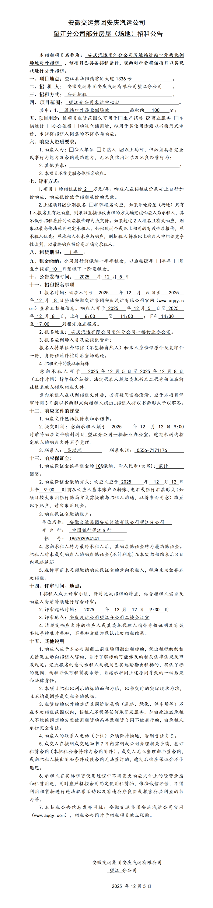 望江分公司部分房屋(場地)招租公告