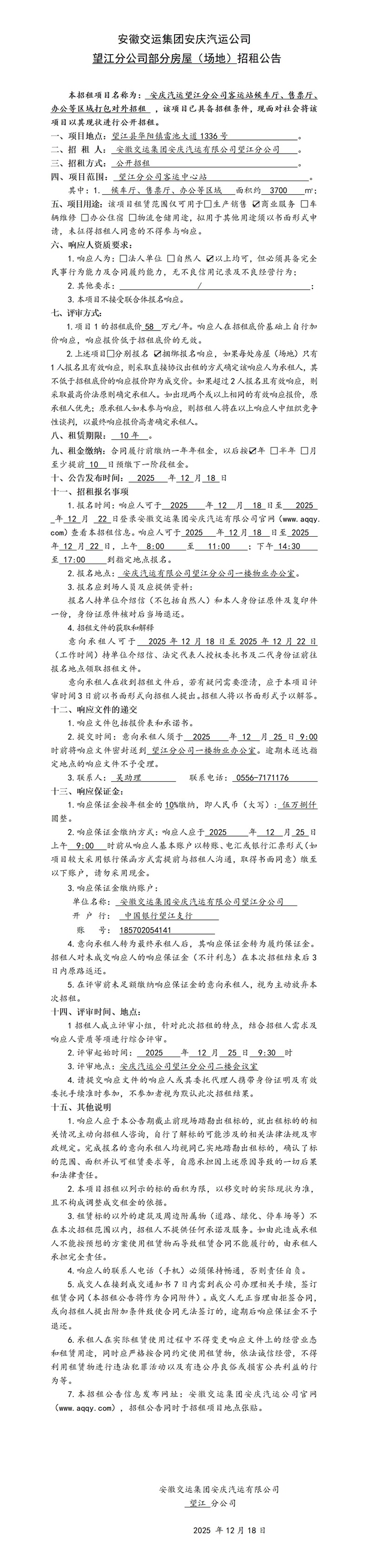 望江分公司部分房屋(場地)招租公告
