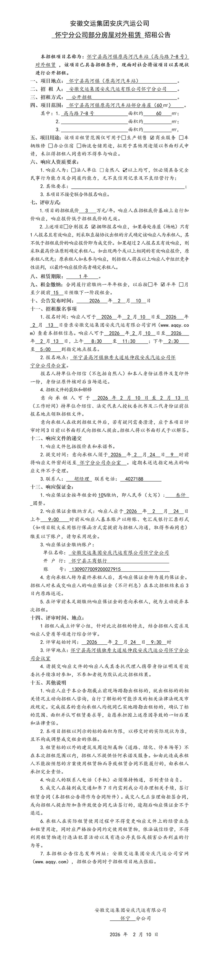 懷寧分公司部分房屋對(duì)外租賃招租公告