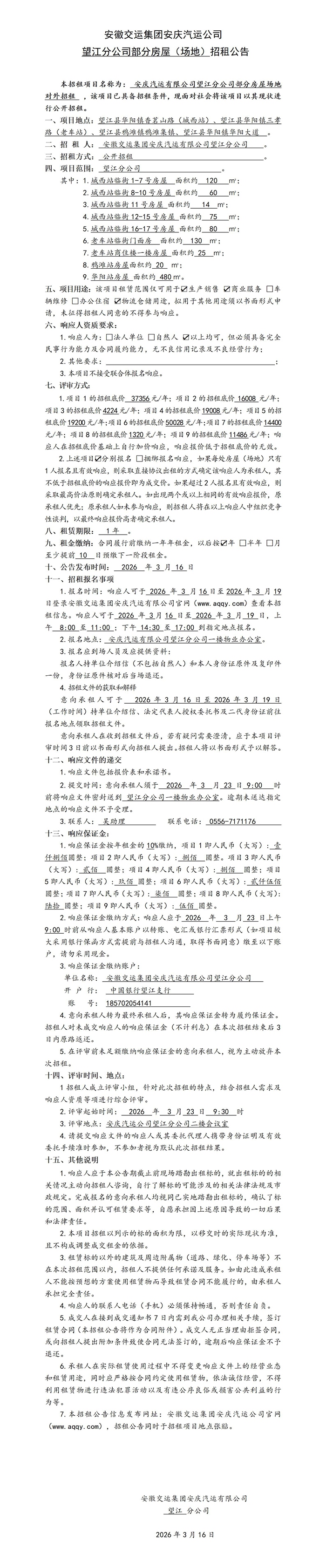 望江分公司部分房屋(場(chǎng)地)招租公告