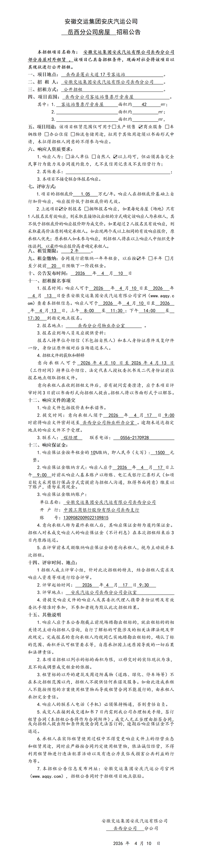 岳西分公司房屋招租公告